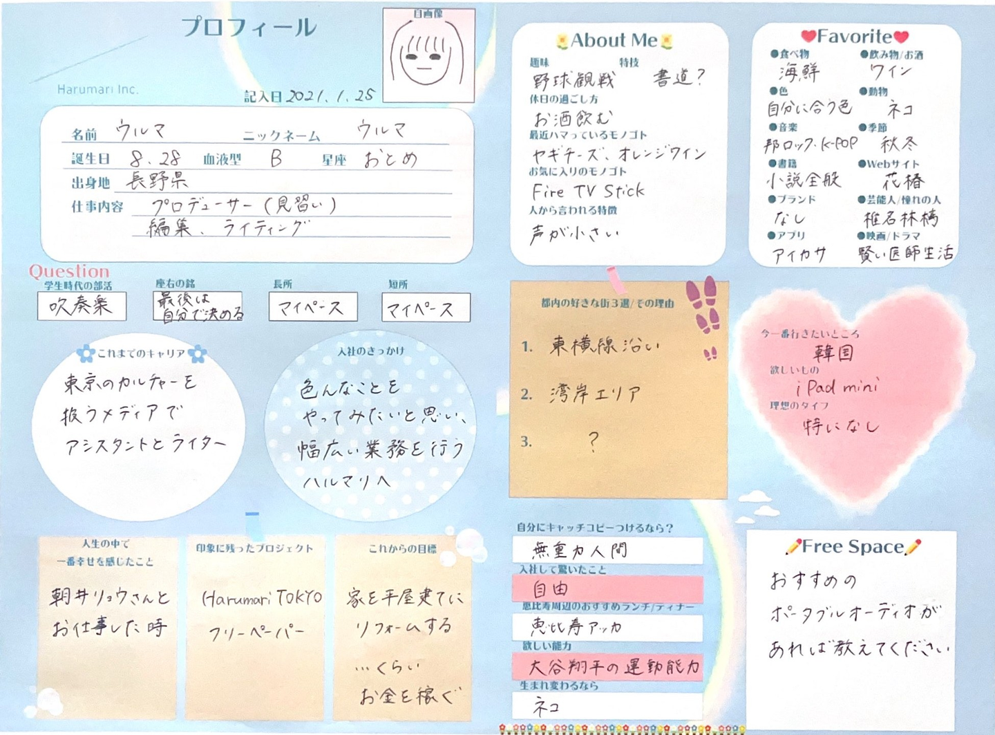 ウルマ「ハルマリに入社する前は、東京カレンダーで編集アシスタントとライティング業務を担当していました。前職ではその与えられた2つの業務しかできなくて、自分にその仕事が合っているのかがわからなかったので、もっと自分の適性を見極めたいと思うようになりました。そう思っていた時にハルマリを見つけて、一人ひとりがプロフェッショナルで、多岐にわたる仕事をしていると書かれているのを見て、『いろんな仕事ができるのはいいな、挑戦してみたい』と思って応募しました」