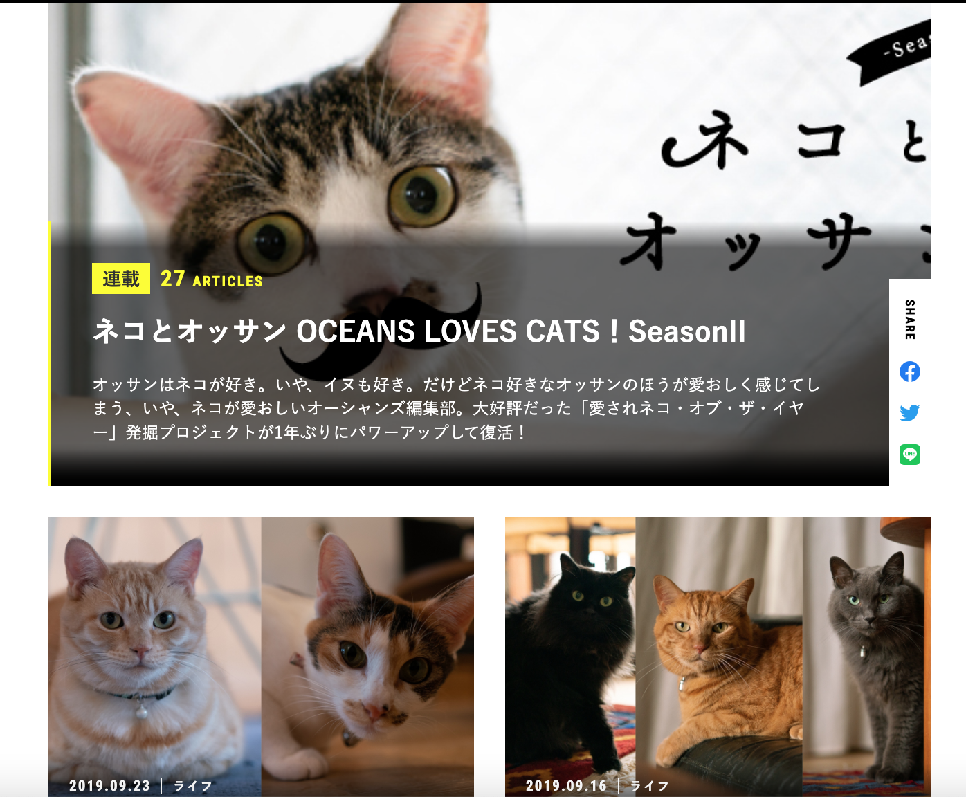 OCEANSでは、記事編集や広告運用などを担当。ネコ好きが高じて“ネコとオッサン”という連載を担当したりしました。最初は慣れない業務に苦労した時期もありましたが、その分気づきも多かったと話します。