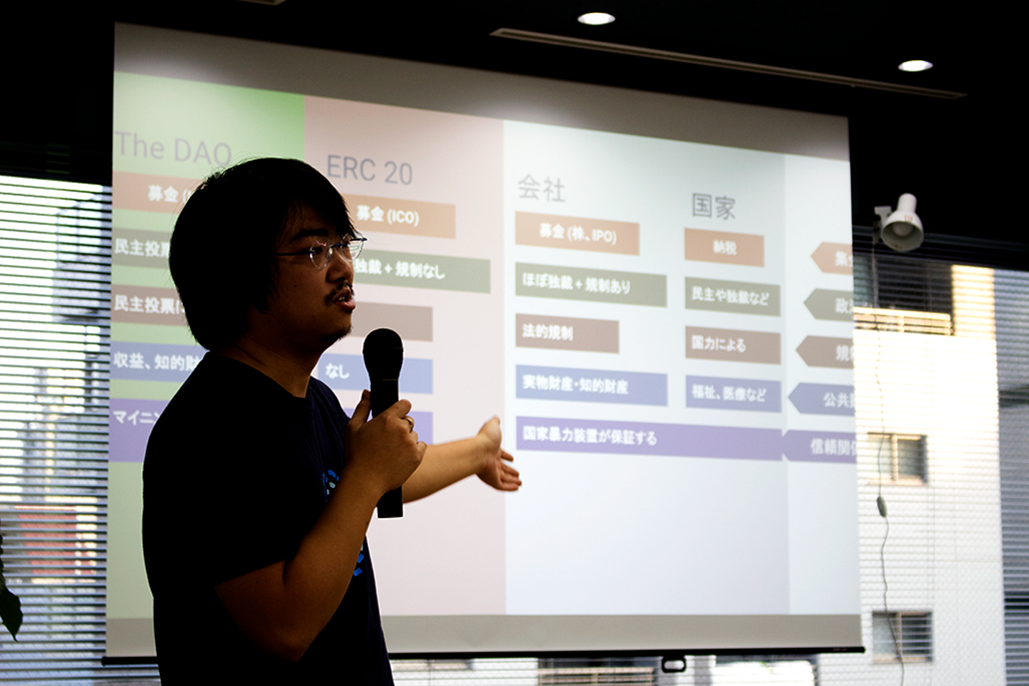 登壇では今の人間組織を例として「国家」「会社」「ERC20」「DAO」とカテゴライズした上で、更にそれぞれの構成を「集金(方法)」「政治」「規制」「公共財」「信頼関係」と区分けし、これら全ての人間組織に課題があり、分散型組織と言われるERC20に該当する組織も実態は完全な分散型組織ではなく、(「国家」や「会社」がそれぞれ規制、公共財、信頼関係に保証される一方で)規制や公共財、信頼関係のないものに人々が投資を行なっていると説明されました。