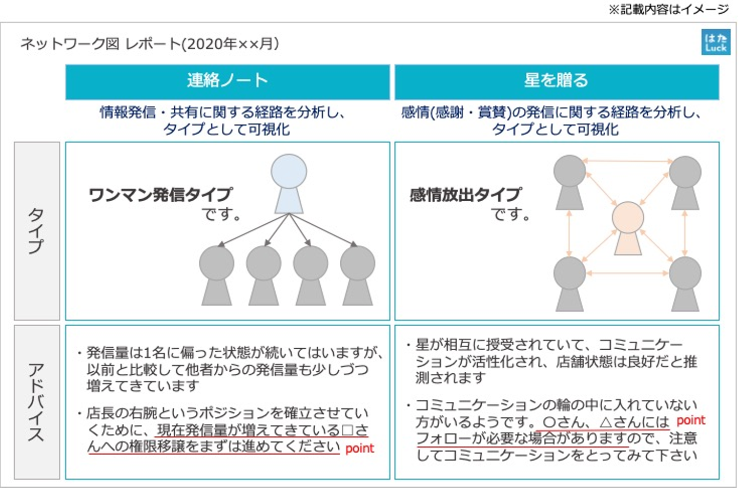 これははたLuckで集計したデータを分析して、店舗内の関係性を可視化できるというもの。