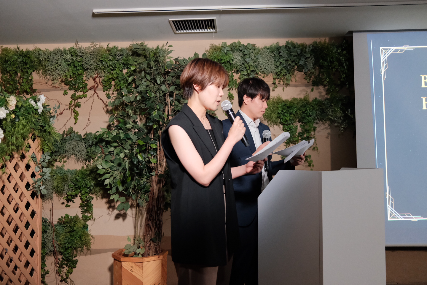 HATALUCKの総会は2部構成になっており、第1部の表彰式ではこの上半期でHATALUCKのVALUEに則り最も成果を挙げた人やプロジェクトを表彰し、第2部では新卒による3ヶ月研修の成果発表と社外監査役の北先生の講話を実施しました。