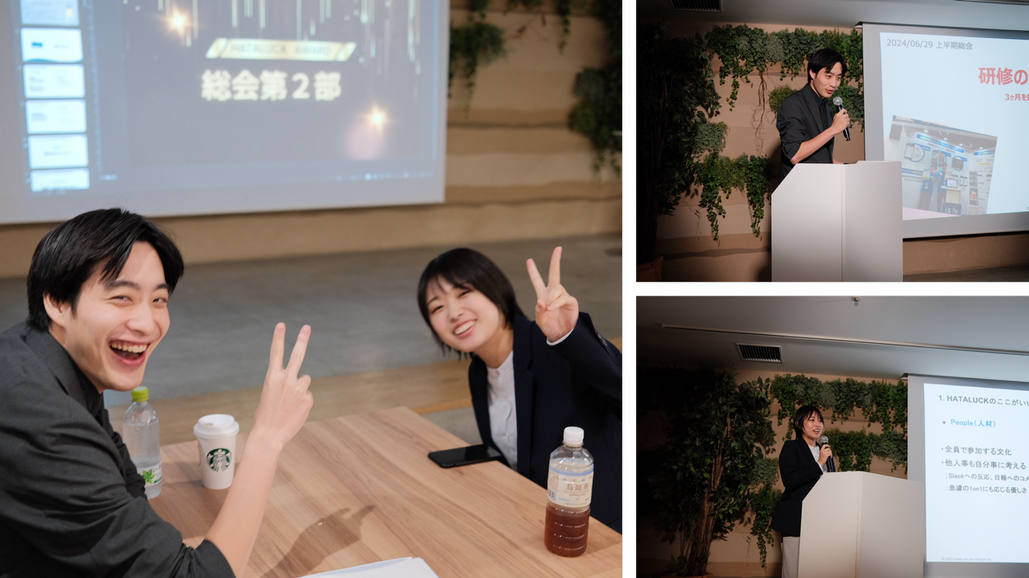 今回の総会は、2025年の新卒採用の内定者6名もゲストとしてお呼びして、総会前に自己紹介と「なぜHATALUCKに入社を決めたのか」をお話しいただきました。