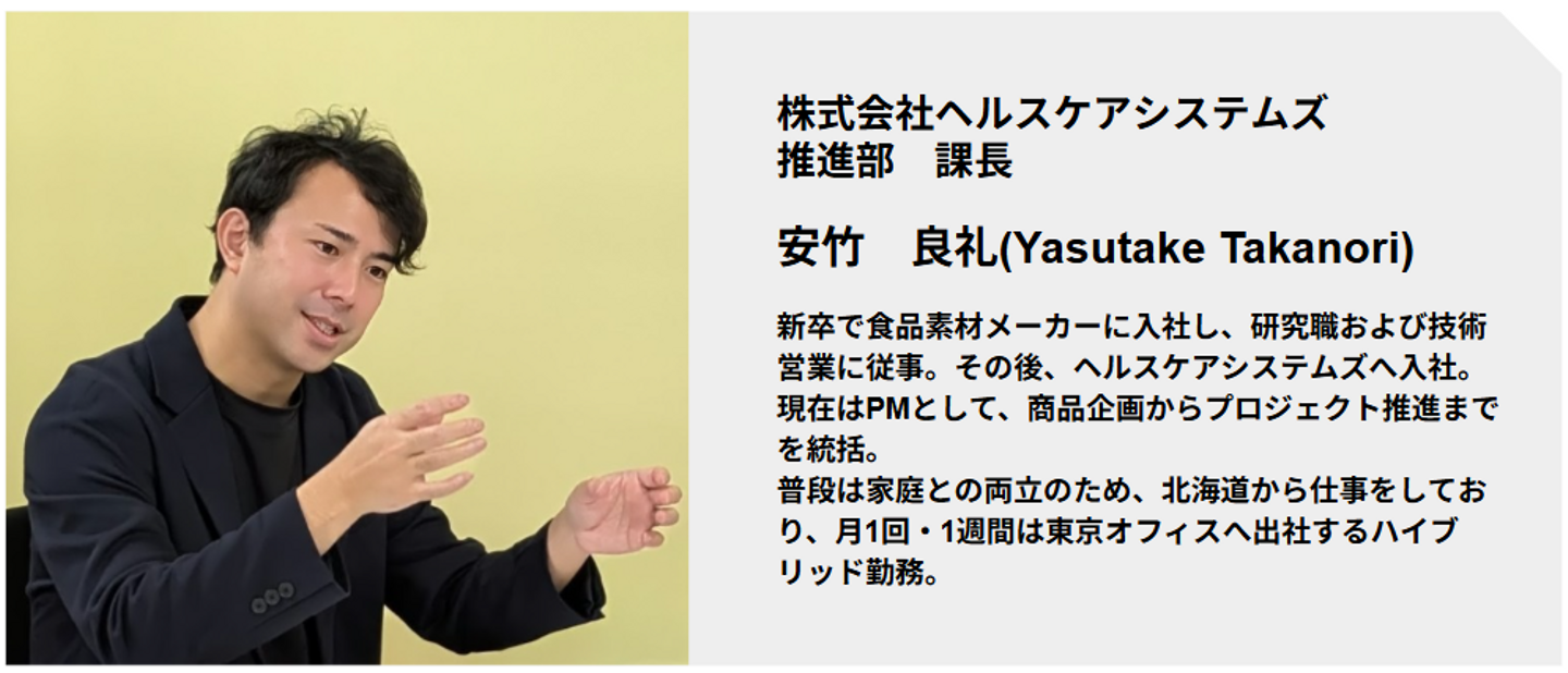安竹:そうなんです。前職では、食品素材の研究や技術営業をしていました。ただ、30歳を目前にキャリアについて迷っていて。実家がサプリメントの小売業だったこともあり、「経験則ではなく、もっと科学的なデータに基づいて、その人に本当に合うものを届けたい」と思っていた時に、当社のビジョンに出会い入社を決めました。