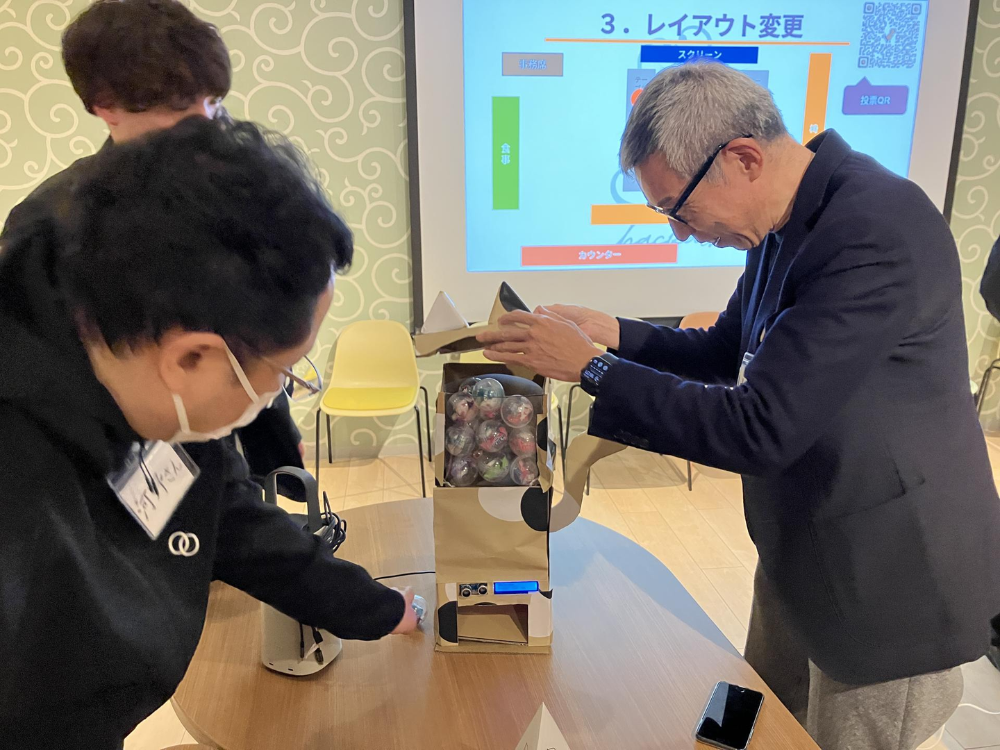 センサーに手をかざすとモーターが回転しカプセルが落ちてくるという仕掛け。動くと同時に音が流れたり、排出トレイが光ったりなど、細やかな工夫もありました。社長・有地さん、HJ開発部長・河野さんも興味津々。