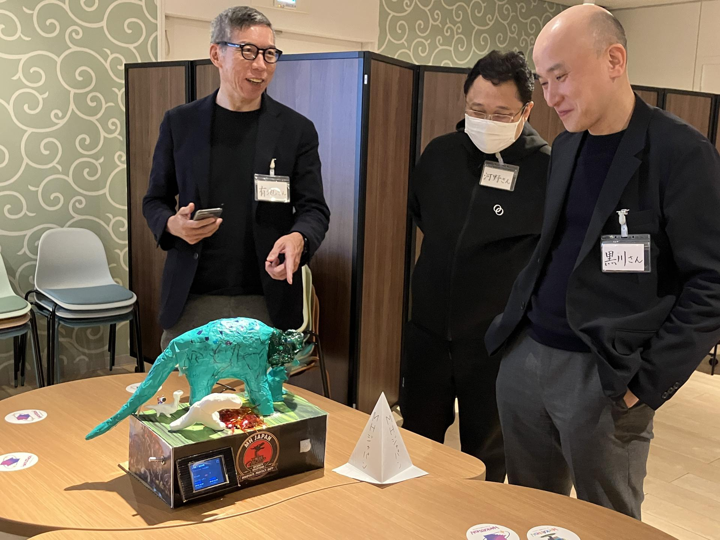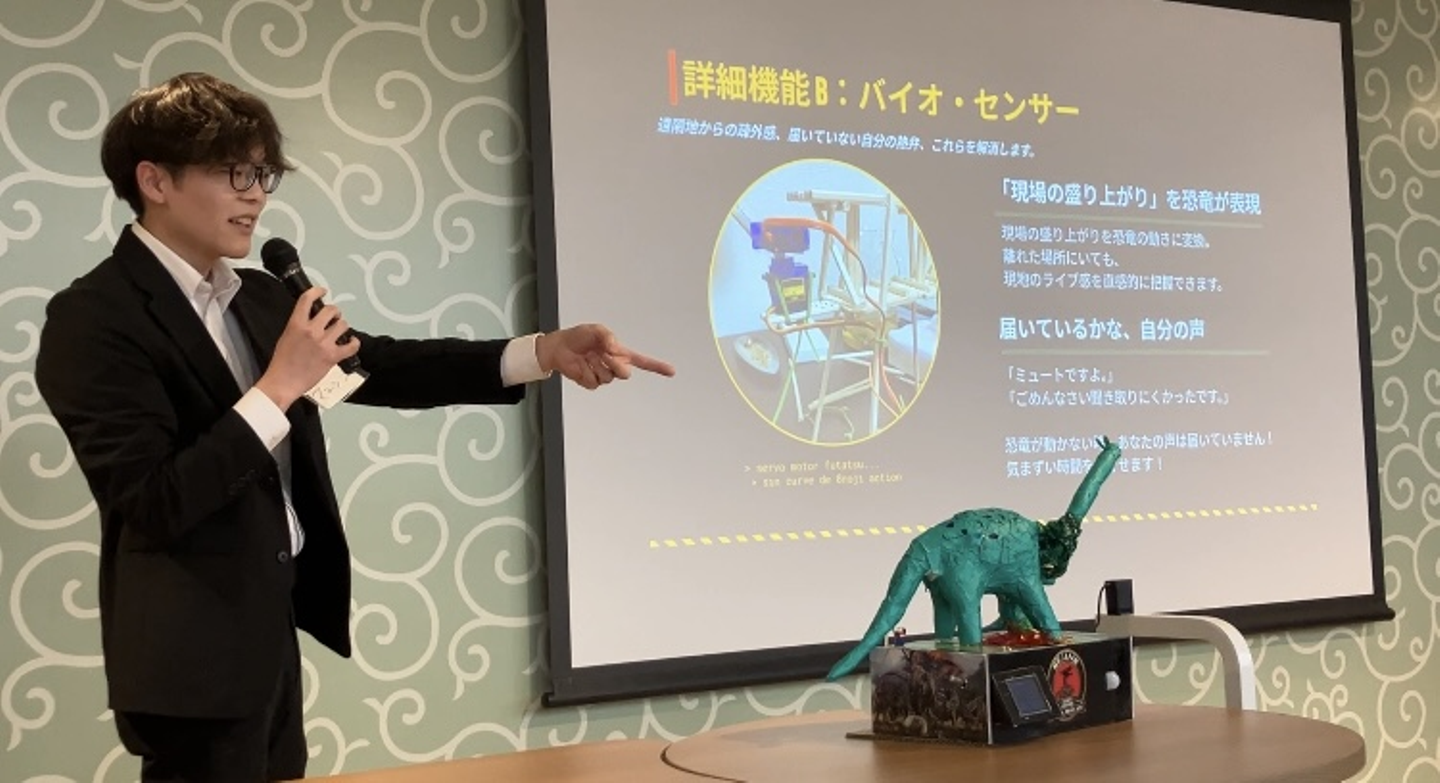 「会議をもっと快適に!」をコンセプトに、会議現場の盛り上がりを恐竜が首を大きく振って表現してくれるユーモアたっぷりな作品。発表中も会場の音声を検知して首を大きく振りまくる恐竜に観覧席からは歓声が上がりました。