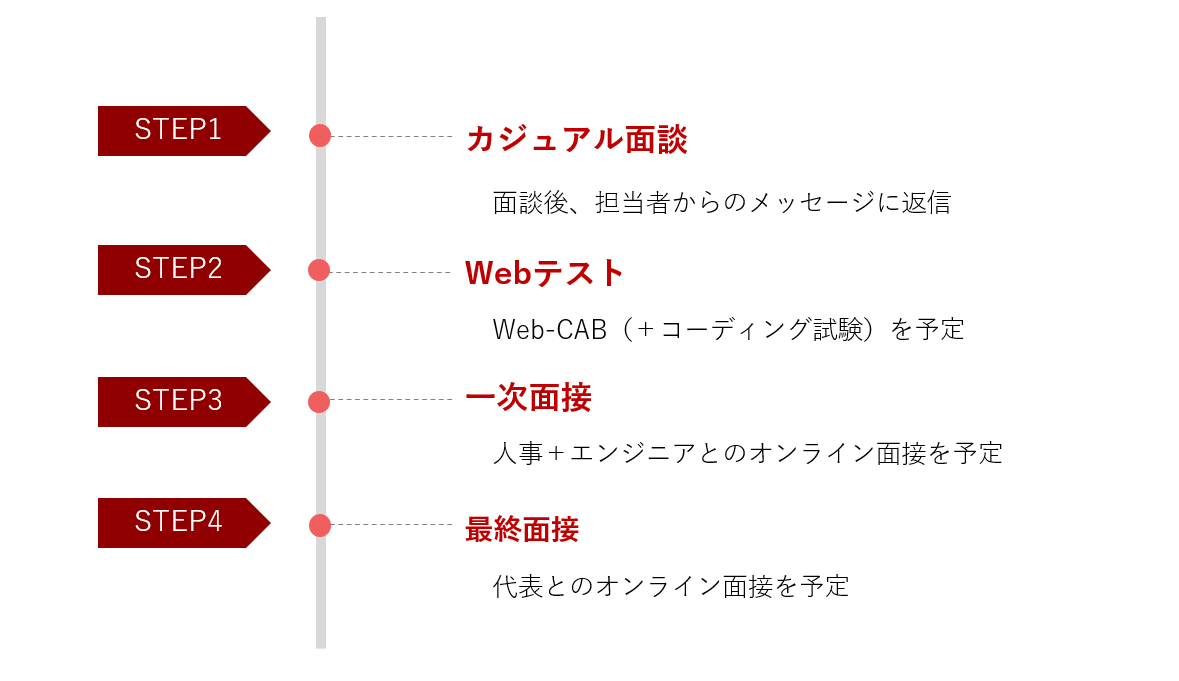 もちろん、カジュアル面談は不要!今すぐ選考に進みたい!という方は、web試験にご案内させていただきますので、別途ご連絡ください。