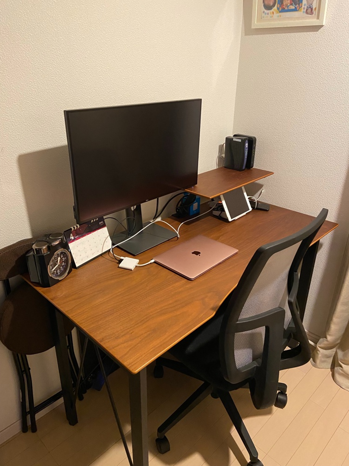 こだわりポイントは、部屋の角のスペースにピッタリ合わせるため机の天板はオーダーし、アマゾンで買った平安伸銅工業のデスク脚をくっつけたところ。
