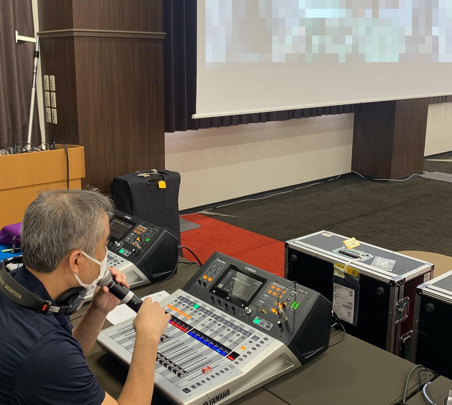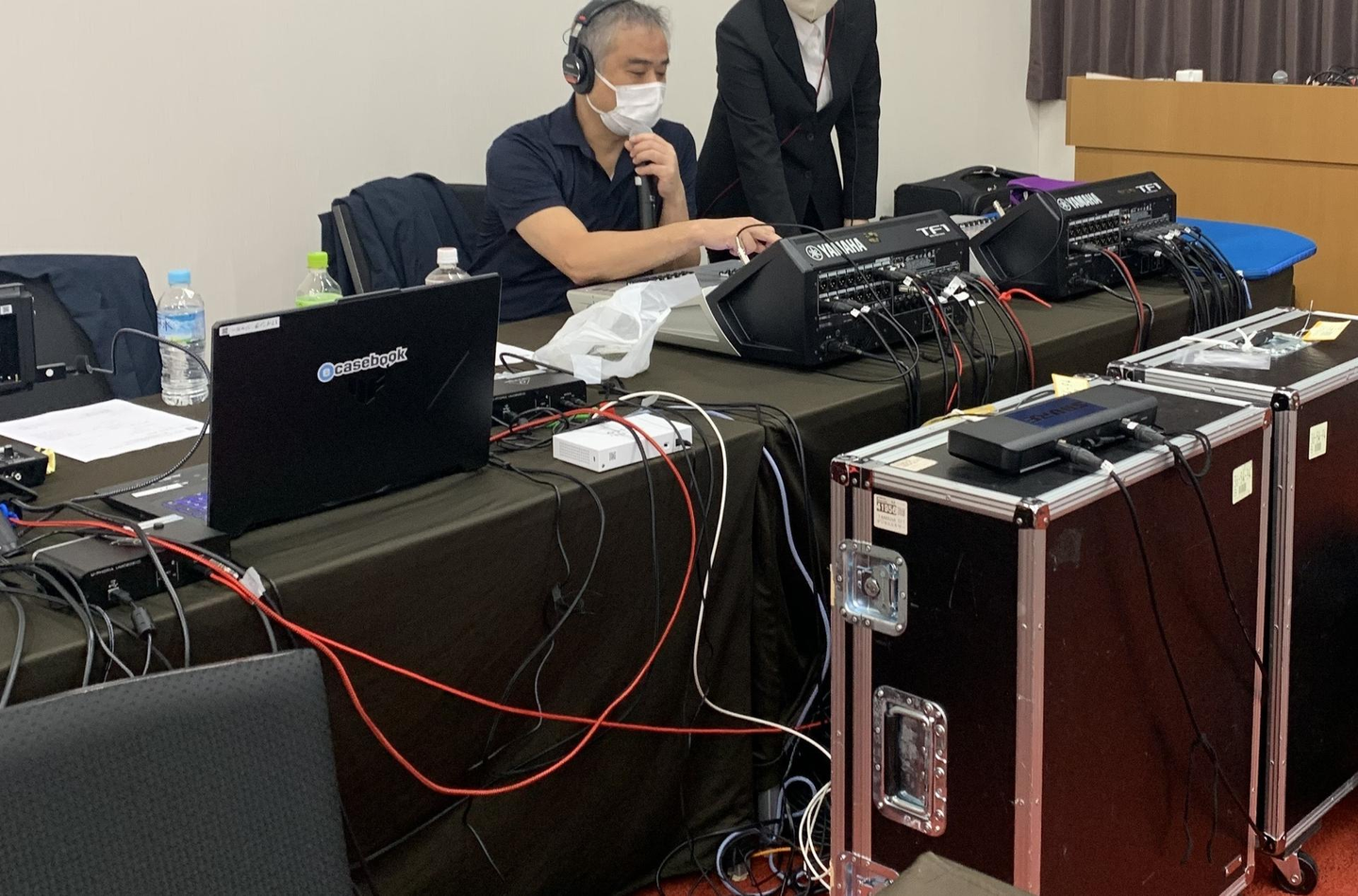 ライブ配信1時間前に、登壇者の先生方がぞくぞくと東京会場に集まります。この日は15名の登壇者に、20名の会場聴講者と大人数です。登壇者の先生が使うスライドの音声を確認します。