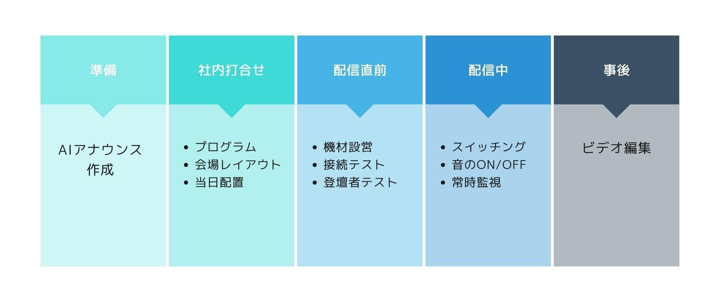 また、ミスが起こらないように工夫していることは、担当者とコミュニケーションをよく取ることです。例えば、ライブ本番当日になって、自分の思っていたこととキュレーターの思っていたことが違うと分かると大変なことになってしまいます。映像部は、キュレーション部、第一/第二営業部、マーケティング部、プロダクト開発部など、部署をまたいで複数のメンバーと一緒にライブ配信を作り上げているので、認識の齟齬をなくした上で本番に臨むようにしています。