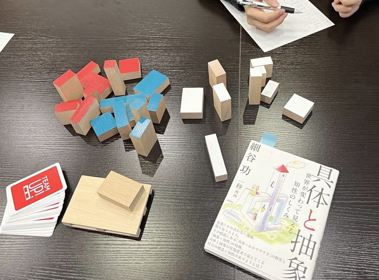 「TEAM UP!」というゲーム。みんなで相談して、木製ブロックをお題のとおり積み上げよう。
