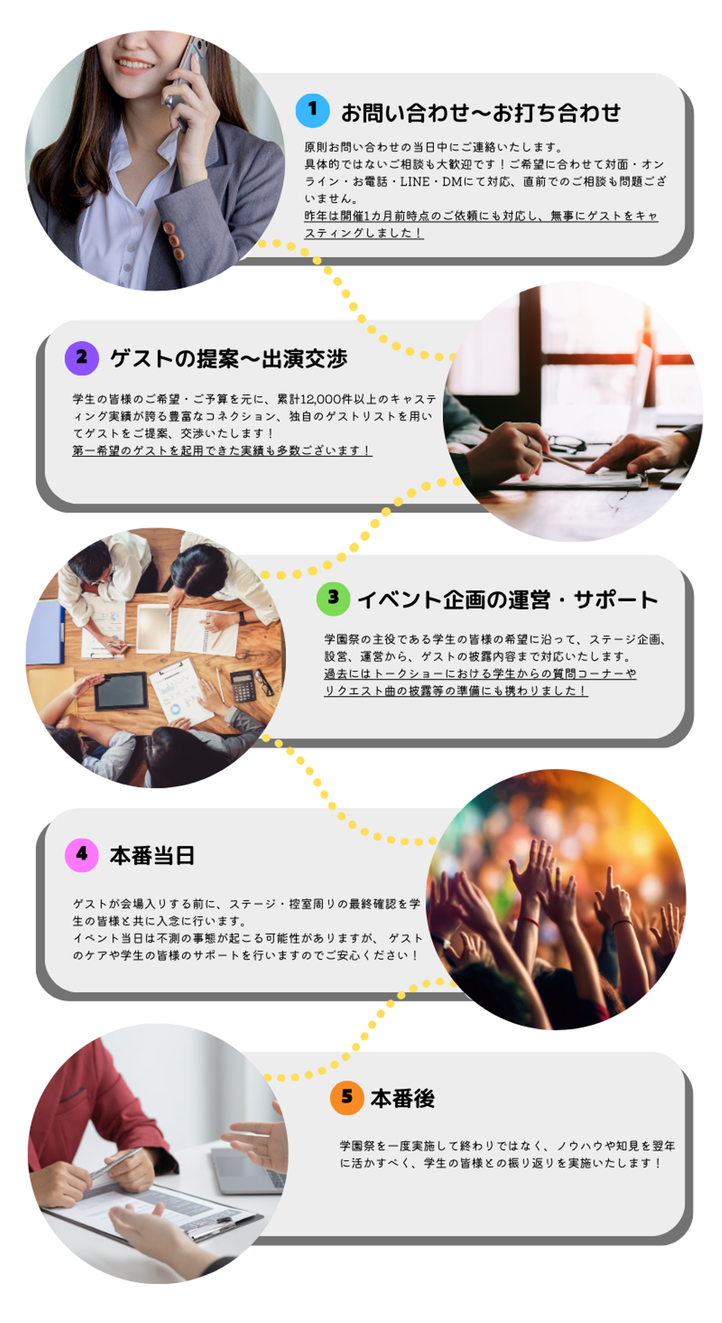 「学園祭のことは何でもお任せください。ゲスト企画、学生企画など最適なサポートを行います!」