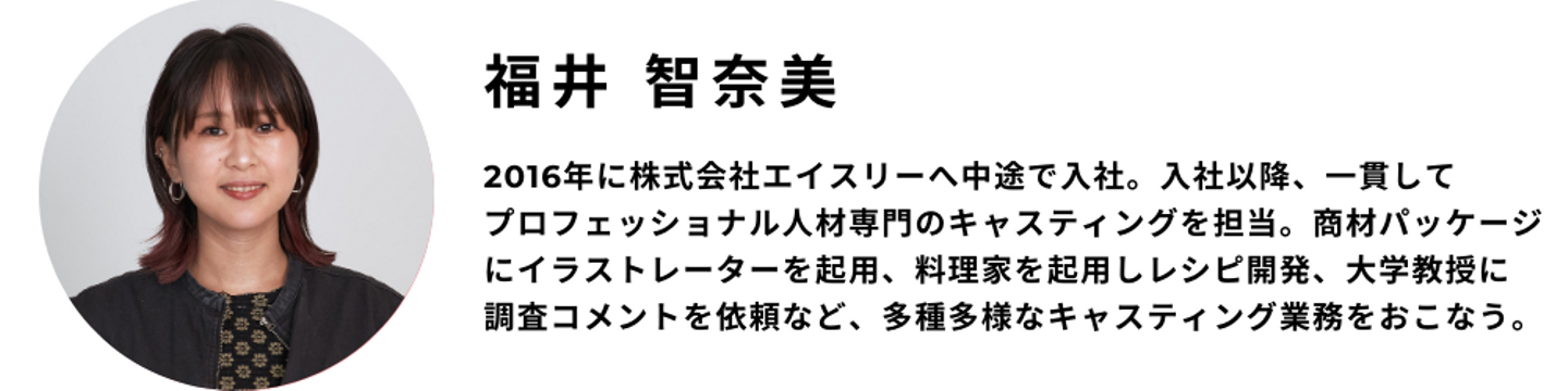 初めまして。プロフェッショナルユニット・キャスティングディレクターの福井智奈美です。