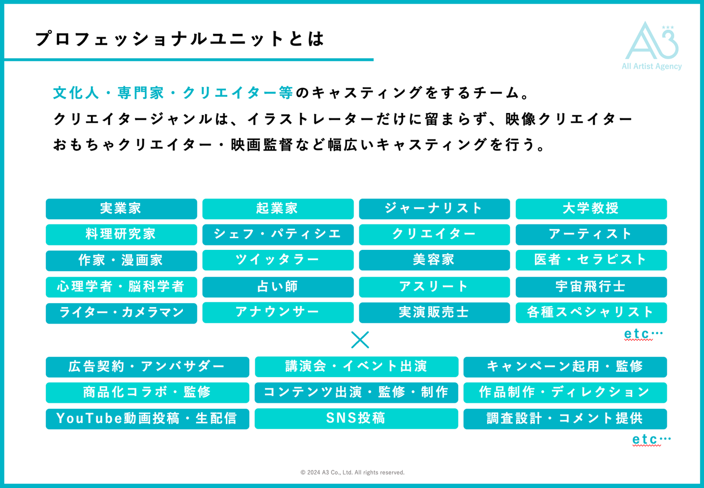 エイスリーのプロフェッショナルユニットとしては、【クライアントもクリエイターも全員がハッピーになる仕事にする】をモットーに日々、調整業務を行なっています。両者が悲しい・嫌な気持ちにならないように調整する為、弊社のような会社が存在しています。