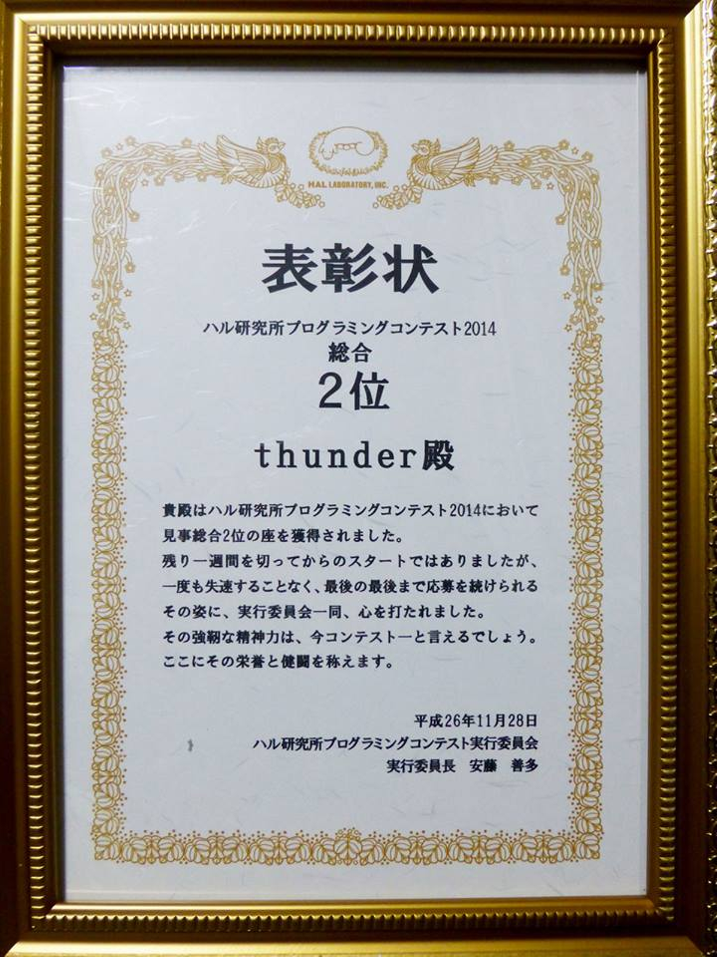 “ハル研プロコン2014”はコンテスト終了ぎりぎりまで1位だったんですが逆転され、実績としては2位となったコンテストです。悔しい思いをしましたが、このコンテストも参加者のレベルが非常に高く、刺激的な経験をさせてもらいました。