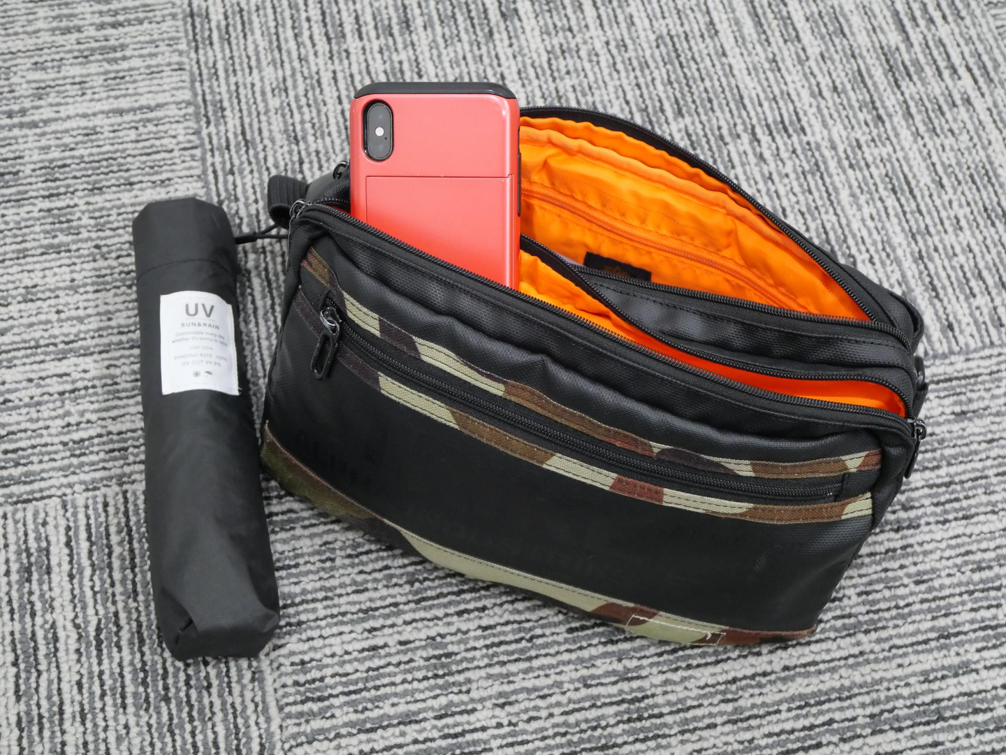 傘は横にひっかけてスタイル。収納力が高すぎてカバンからはみ出すものは何一つありません。