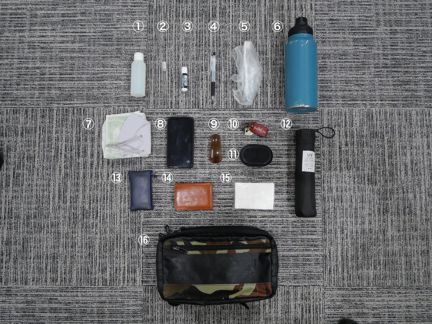 ⑫ 晴雨兼用傘:家の近くにあるドンキで購入。本日(取材日)が雨だったこともあり持ってきました。