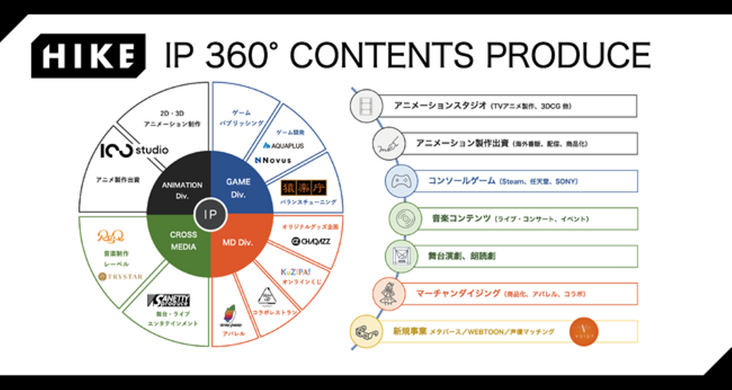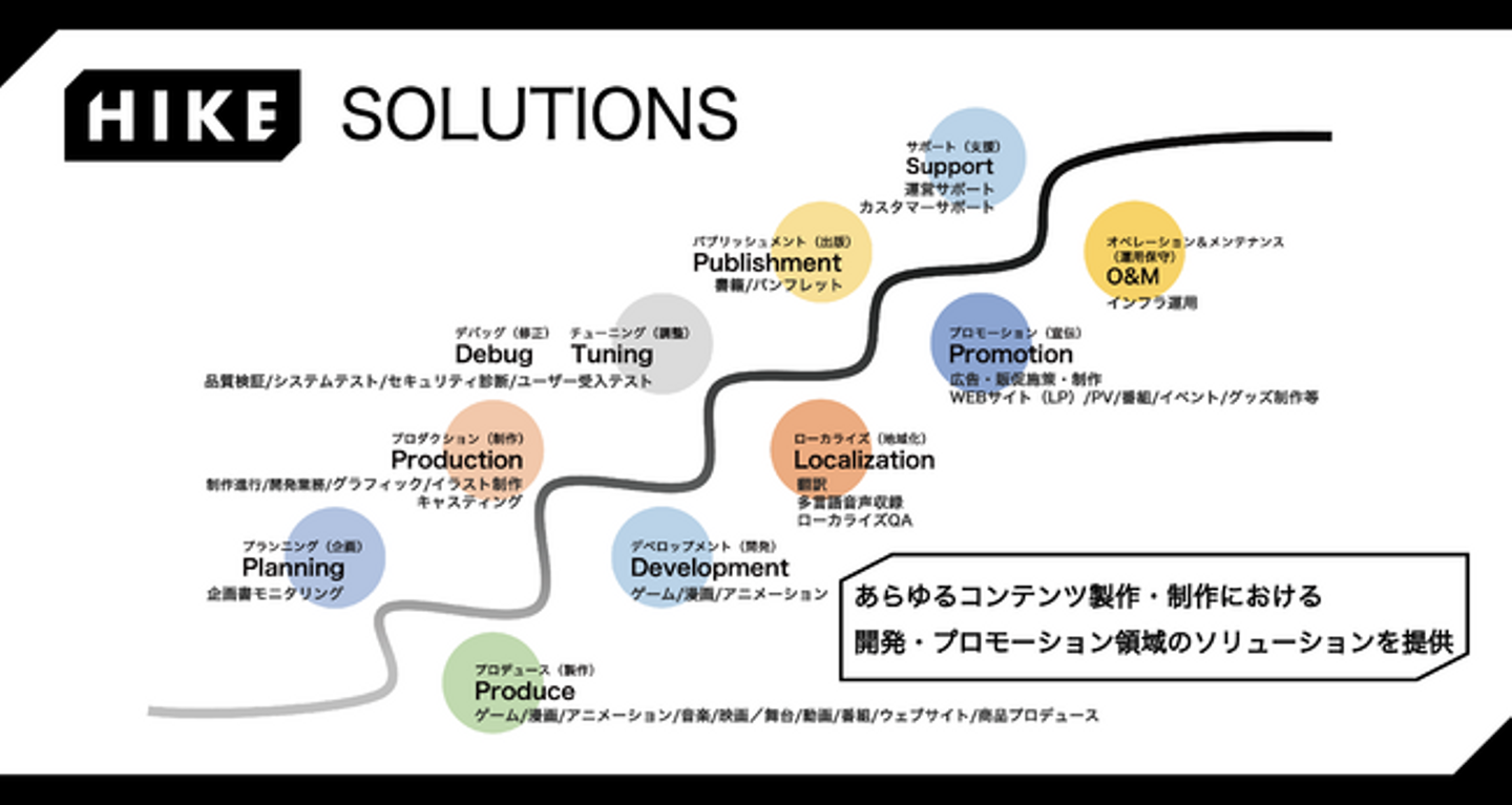 HIKEが属するポールトゥウィンホールディングスは、顧客のサービスやプロダクトのライフサイクルの企画、開発、リリース、運用、改善の工程において、国内ソリューション、海外ソリューション、メディア・コンテンツの3つの業務区分を設けています。その中でHIKEは、toC、toB事業を網羅したメディア・コンテンツの中核を担う会社となります。