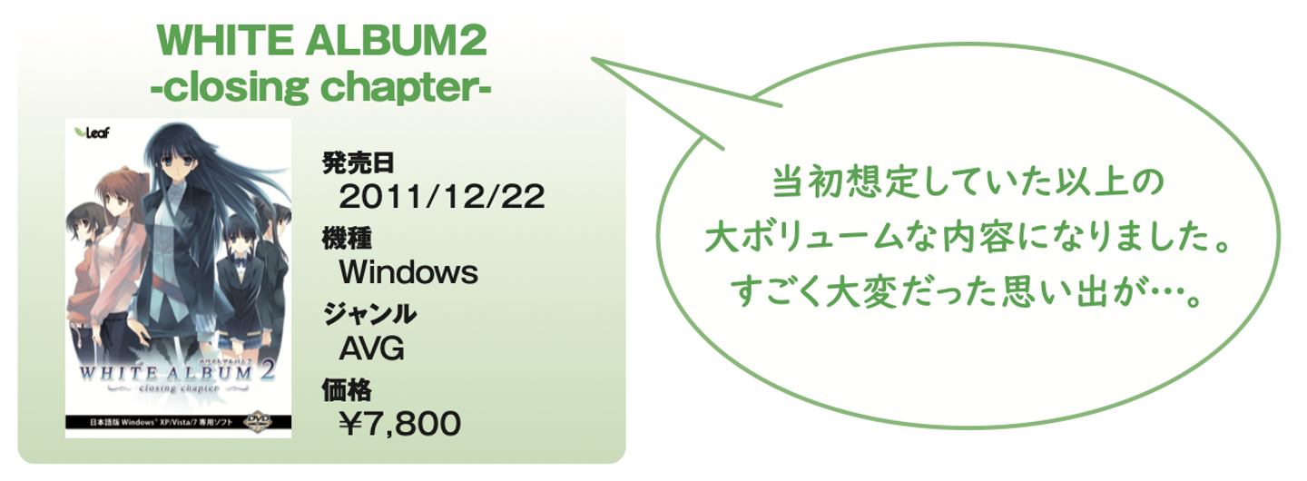 これに対して制作ミーティングで提案されたアイディアが、アクアプラス作品の歴史を網羅した年表でした。さらに、時系列の作品表示に加え、アクアプラスのメンバーが販売タイトルの中でも特に印象に残ったエピソードも記載することに。それは、すでにアクアプラスを応援してくださっている方、まだアクアプラスを知らない方のいずれにも「こういう内情があったのか」という新しい視点を持ってもらいたかったからです。
