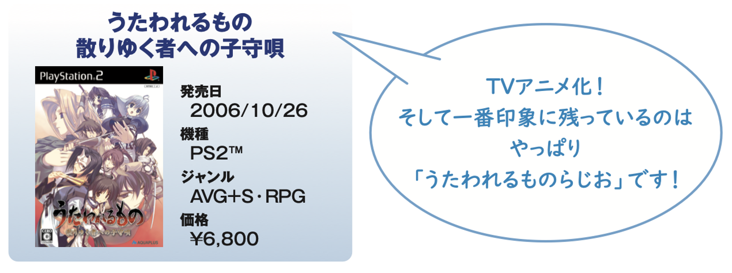 第一面には『うたわれるもの』のクオンとアンジュをメインにしたイラスト、中面では『WHITE ALBUM2』の小木曽雪菜と冬馬かずさの見開きイラストを掲載。そして裏一面にレイアウトしたのがアクアプラス作品年表です。
