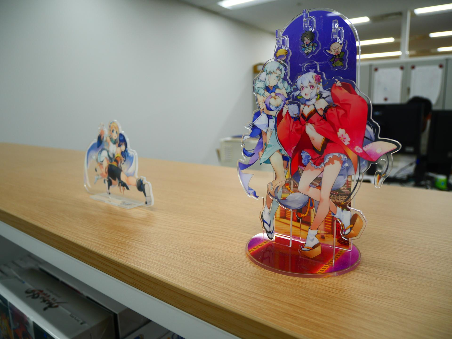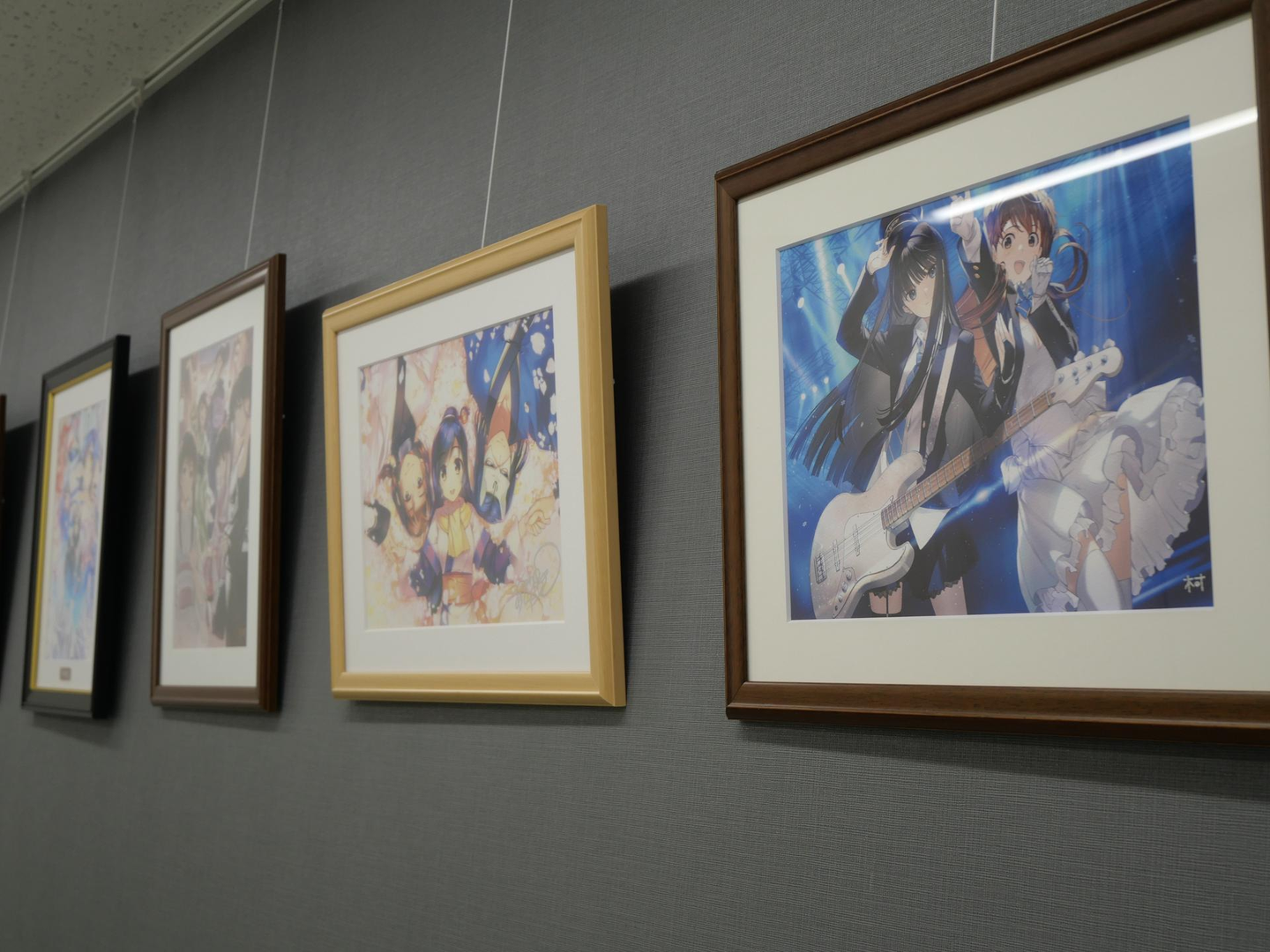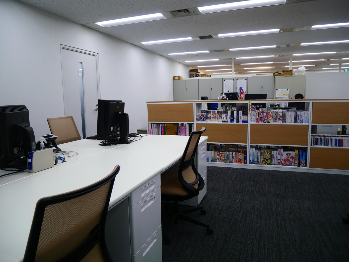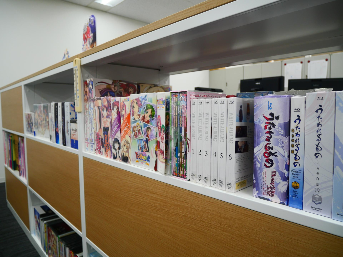 広い会議室と少しコンパクトな会議室が完備されており、写真に映る広い会議室にはアクアプラスが手がけた作品のアクリルパネルやフィギュア、ぬいぐるみが置かれています。きっとこの会議室で、さまざまな作品の打ち合わせや商談がされているのでしょう。