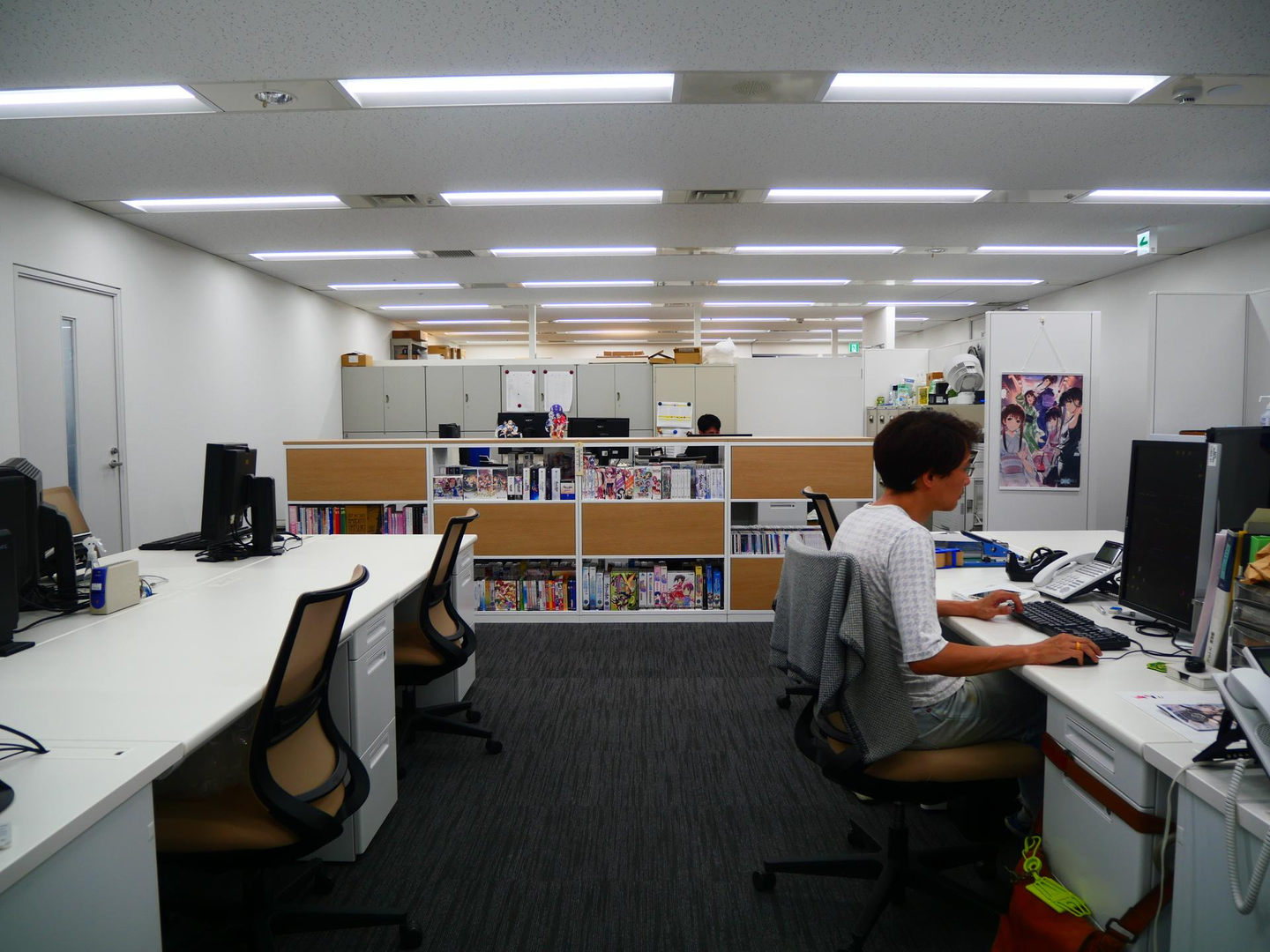 ゲーム会社と聞くと雑多で暗くどんよりした場所に、それぞれカタカタ・ガダガタ、ひたすら作業に打ち込む作業場のような空間をイメージしますが(私だけ?)、アクアプラスのオフィスはとにかく整理整頓され、開かれた気持ちが良い空間が広がります。