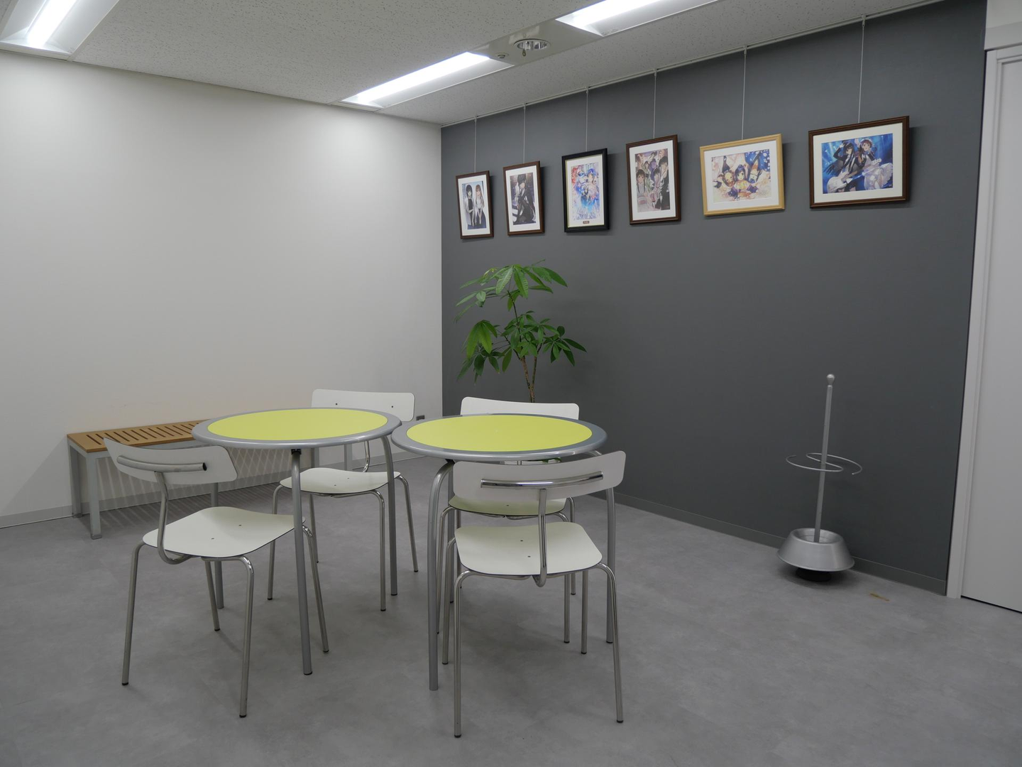 丸テーブル2台に椅子が4脚、ベンチが1台とシンプルながらも「打ち合わせより30分も早く着いちゃった!」と慌てん坊のあなたがそこで待つには十分なアイテムが誇らしく鎮座。壁にはアクアプラスが手がけた名作『うたわれるもの』や『WHITE ALBUM2』のイラストが並べられ、いつまでもゆっくりと眺めたい気持ちにさせてくれます。