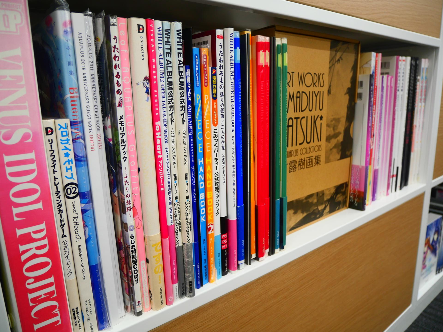 真ん中の棚には手がけた作品が並びます。もうここであえて触れる必要はありませんね。わかる人にはわかる。ゲーム・アニメ・音楽・イラストブック…メディアミックス展開を物語る名作よドヤ。