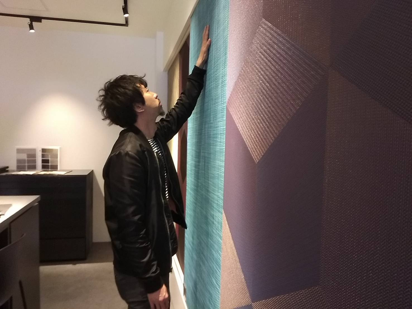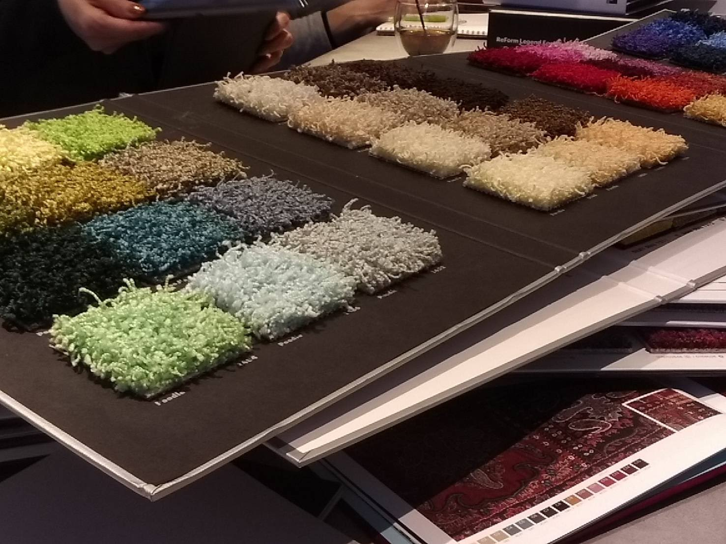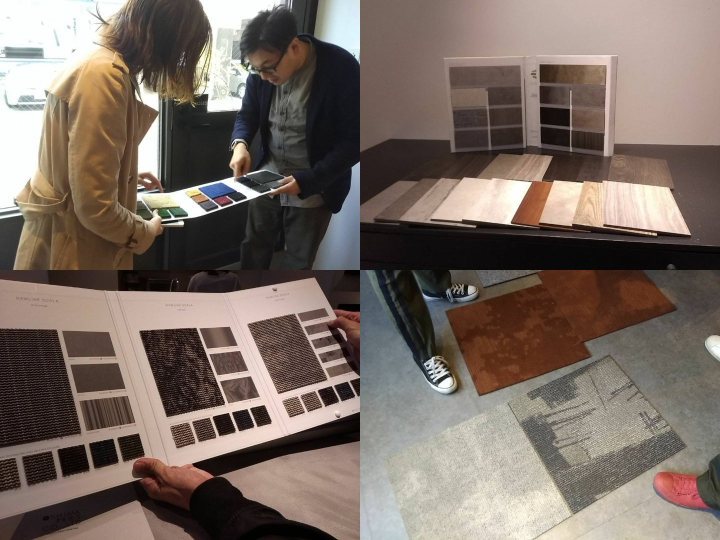 たくさんのカーペット・床材サンプルを触ってみたり、床に敷いてみたり。写真で見ただけだと「なんとなく柔らかそう」と思っていたものが、「実際は硬かった!」なんてこともあったそう。
