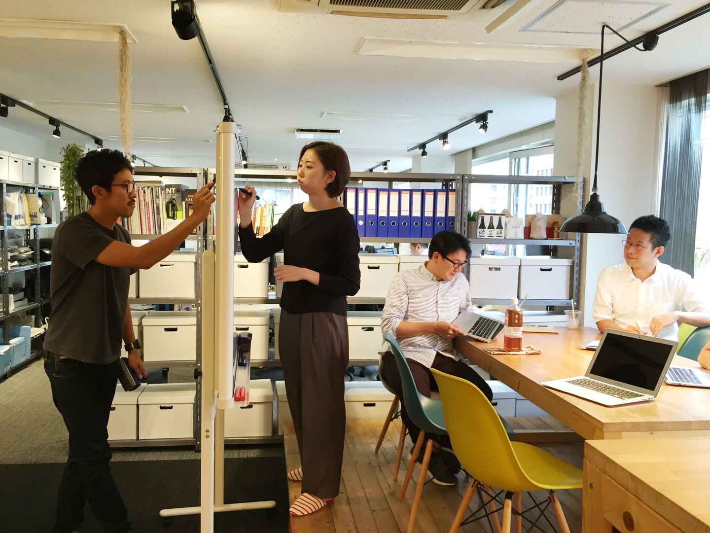 さらに、両面使える移動式のホワイトボードも置いてあります。書いたものを裏面に取っておけるだけではなく、以前の手狭だったオフィスの中では「間仕切り」のように使いながら両面で別のミーティングをしていたこともありました(!)