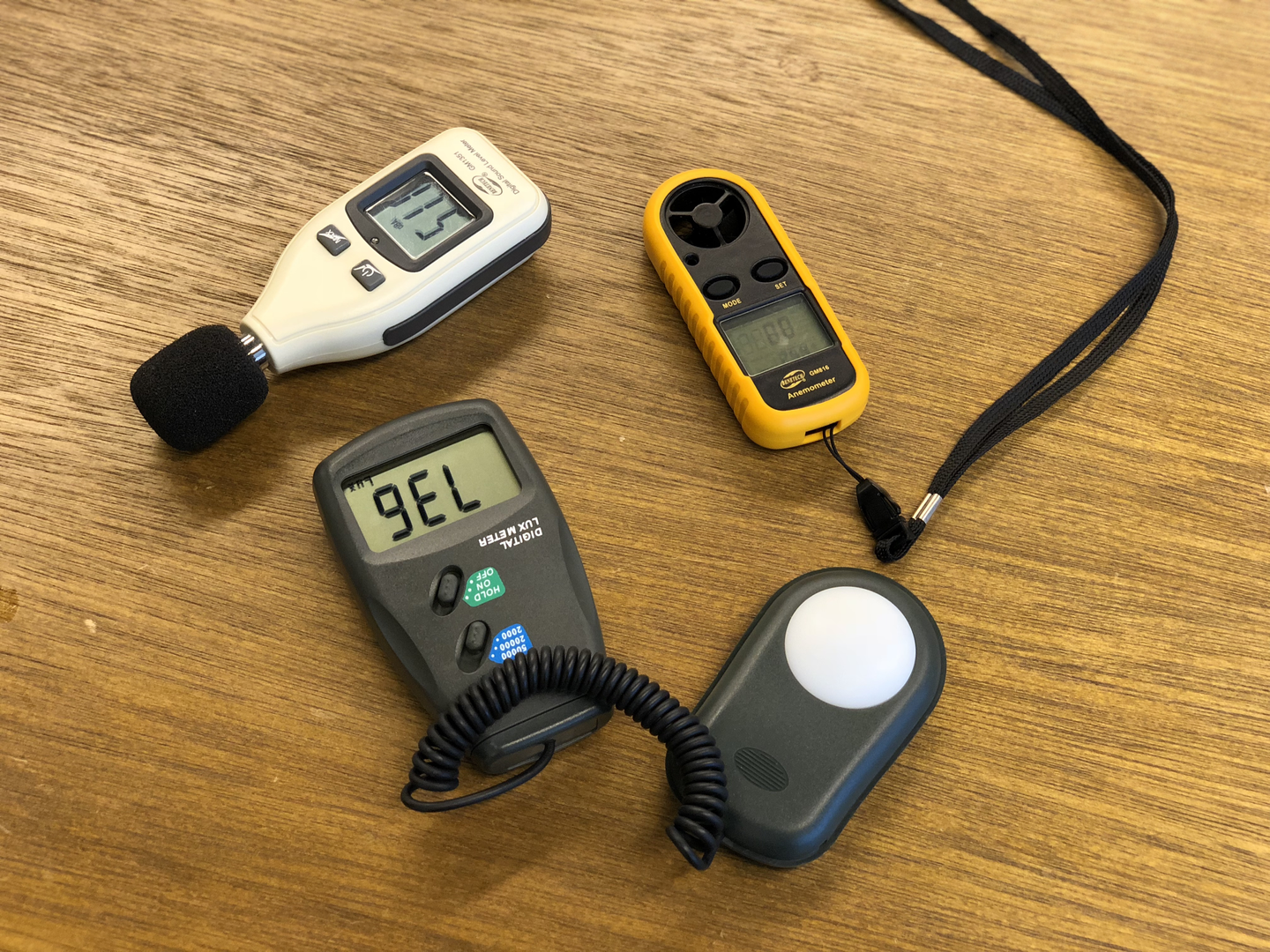 あまり見慣れないツール類ですが、こちら、白は騒音計・黄色は風力計・黒は照度計なんです!