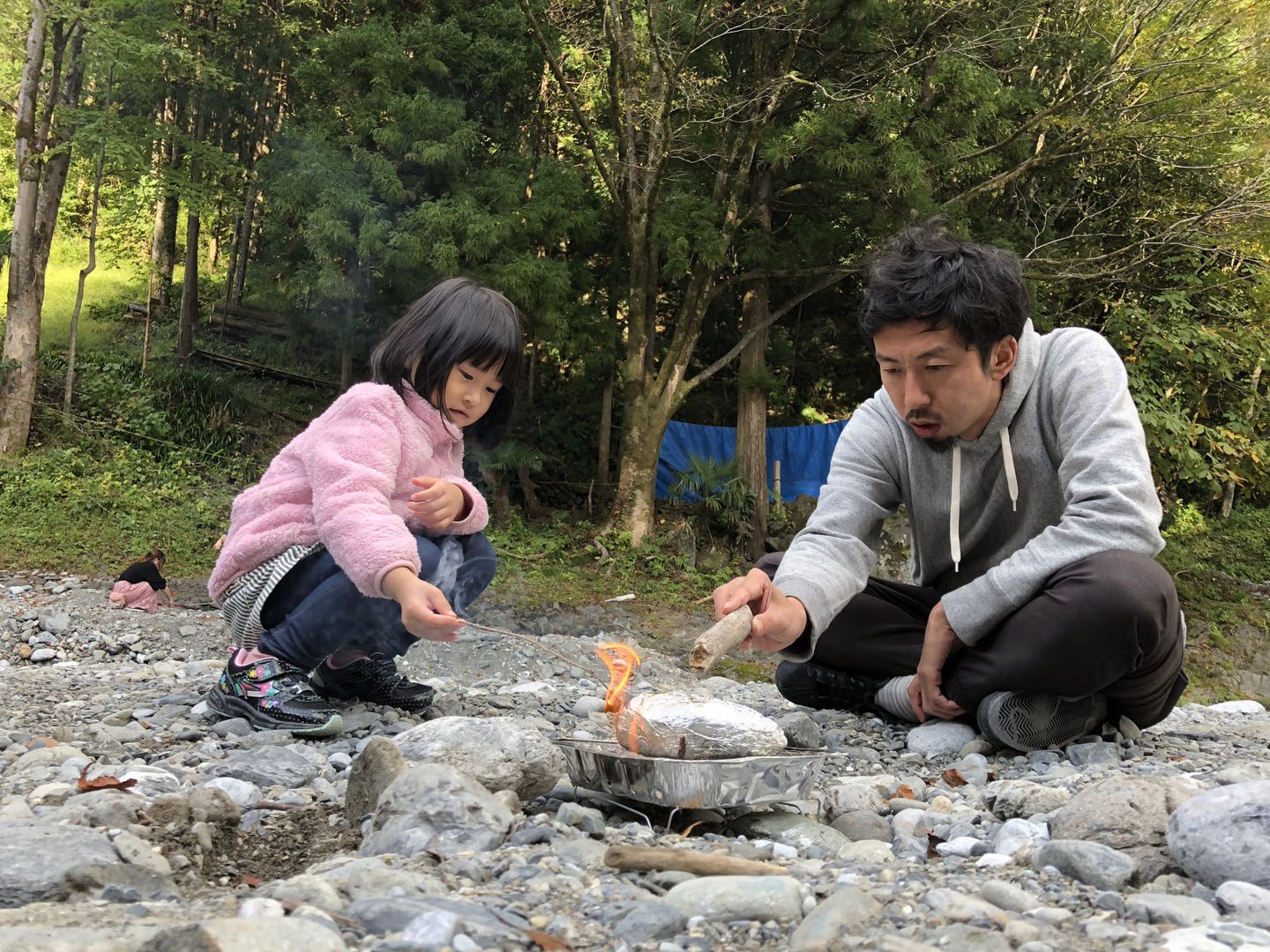 お料理を待つあいだ、まったり河原で焼き芋タイム〜(さつまいもは持ってきました)