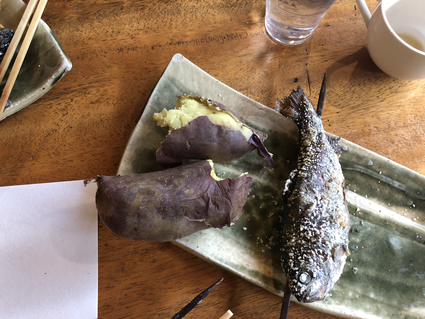 その後、パラパラと雨が降り始めた頃に、ちょうど焼き芋とニジマスと焼き上がりました!(ナイスタイミング!)