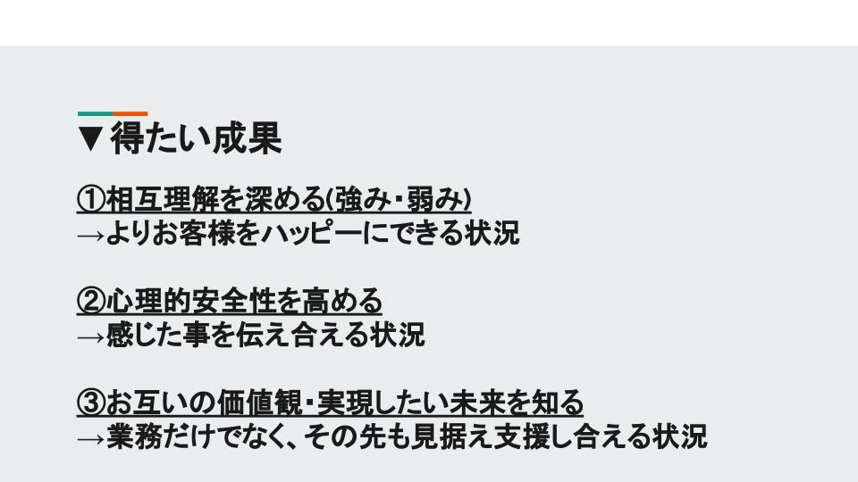 それを今回の目的として置きました。背景としては、モチベーションクラウドのアンケート結果も関係しています。営業部の組織として期待値が高く、満足値が低い部分は「組織風土」だったんです。もちろん、メンバーの立場や経験年数によっての解釈の幅はあると思いますが、相手のことを知ることでお互いを尊敬し、安心して背中を預けることができるよね。その関係ができるということは結果的に、お客様へ良い価値提供ができるよね。という考えにたどり着きました。