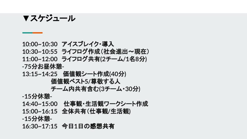 ファシリテーションも必要ないので、とても簡単なアイスブレイクです。解説をすると、「なるほど〜」という声が漏れ、今日どんなワークが進んでいくんだろう?というみんなの空気感も感じることができました。すこしは肩の力がほぐれたかな?