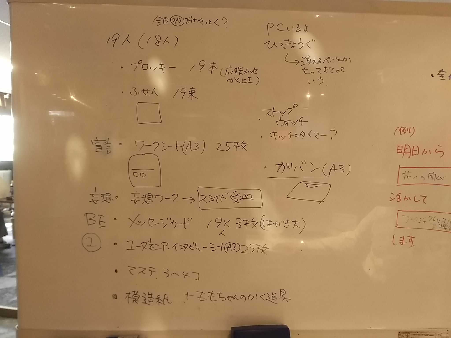 ・プロッキー(プロッキーは模造紙への書き込み用。油性ペンはテーブルに色が付くのでNG)