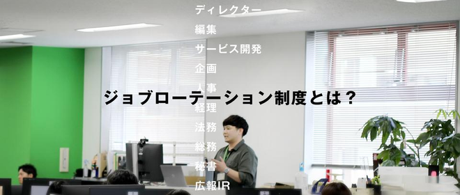 その一つとして、年に一度の組織編成では、働きたい部署・職種を希望できるジョブローテーション制度を実施。平均8割を超える希望が実現しており、未経験からのジョブチェンジも。事業やサービスの展開に伴ってキャリアの選択肢も広がっています。