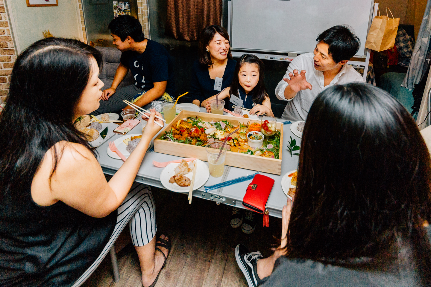 みんなお楽しみのごはんは、スープやサラダ盛りだくさんの身体に優しく、カラフルで見た目も楽しいケータリングでした!美味しいごはんとお酒やジュース片手に、ますます話しは盛り上がります。