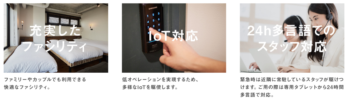 「無人コンパクトホテル」とは、 民泊でもホステルでもホテルでもない、新しい気軽な宿泊施設。アクセスの良い都心の立地にオシャレな個室と低価格の 「良いとこ取り」なホテルを提供しています。実はHostyでは、創業当時から昨年(2017年)まで民泊の運用代行事業を行っていました。Airbnb日本上陸時、いち早く運用代行業を開始したのがHostyです。400件以上の運用実績があり、メディアで取り上げられたことも多数。宿泊施設の運営ノウハウがあるHostyだからこそ、そのノウハウを生かし、無人コンパクトホテル運営を行っています。Hostyの無人コンパクトホテルの特徴としては、以下の点が挙げられます。
