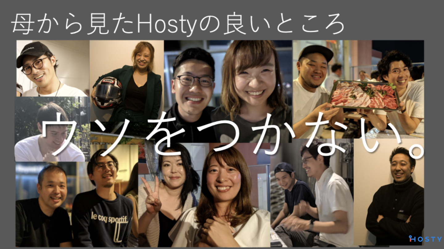 今回来ていただいたゲストの方はほとんどがHostyメンバーの元同僚や友人の方々。それはつまりHostyのメンバーに魅力があって、また信頼があって集まってくれたのかなって勝手に解釈しています。(笑)そして、イベントの1コンテンツとして、出資していただいているKDDIの方から「Hostyの魅力」を語っていただきました。その中にメンバーの良いところとして「ウソをつかない」というものがありました。もし表面上の関係で仕事だけで完結している間柄であればウソをつき続けても問題はないですが、Hostyは全員が使命を持ち仕事を超えて各々を尊重する文化が非常に強い会社です。信頼において非常に大切な「ウソをつかないこと」を評価してもらえたのは、会社として大切にしていることは無駄なことではないんだなということがわかりました。また、これから組織が拡大しても、「ウソをつかない」など基本的なことはずっと大切にしていけたらなと思います。
