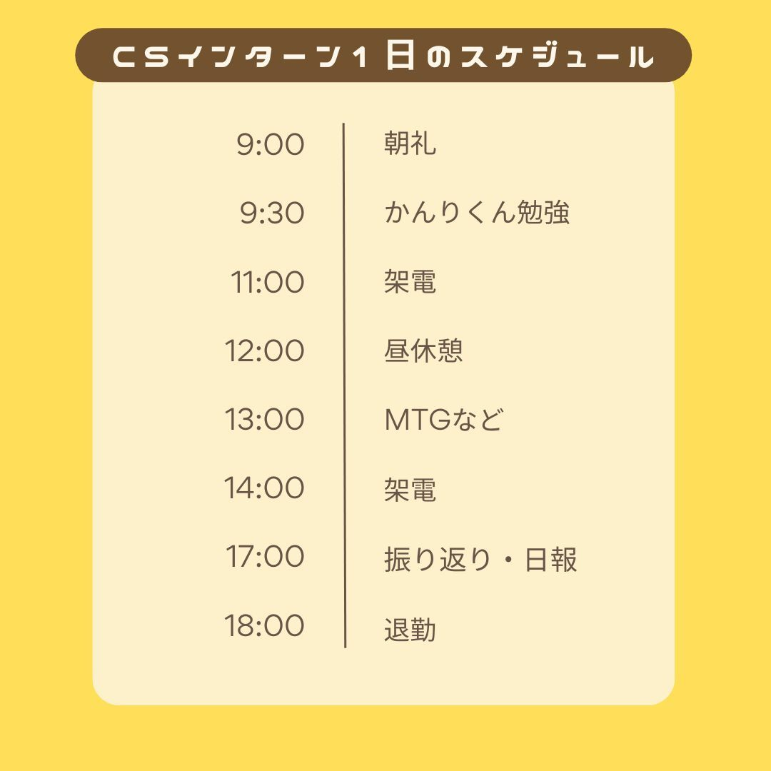 一番始めに朝礼で昨日のトピックス・その日の個人の目標をCSグループ内で共有してからその他業務が始まります。