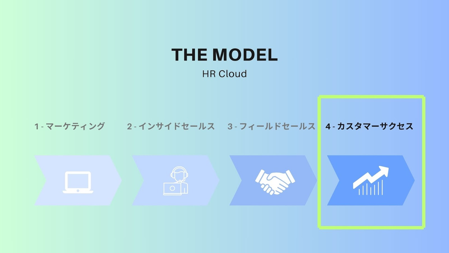 HRクラウドでは、The Modelという「部門ごとの情報を可視化し、それぞれの特性や専門性を最大化することで生産性を向上させる」営業プロセスモデルを取り入れており、MK(マーケティング)、IS(インサイドセールス)、FS(フィールドセールス)、CS(カスタマーサクセス)の4つの部署に分かれています。