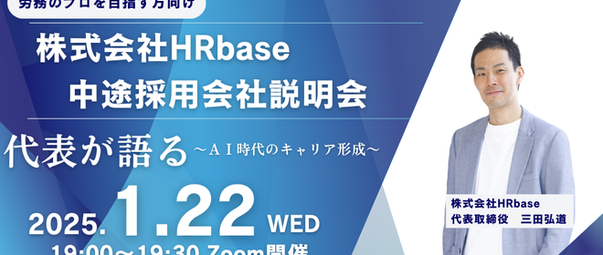 \株式会社HRbase、初の中途採用会社説明会を開催しました/HRbaseでは今後も、Wantedlyのストーリーで採用の情報や会社の情報を発信していきます📣新着情報をいち早く知りたい方は、WantedlyでHRbaseの"フォロー”お待ちしております!より多くの情報をお届けいたします!こんにちは、株式会社HRbase 採用担当の万木です!当社では、2025年1月22日に中途採用会社説明会を開催いたしました!◼︎代表が語る〜AI時代のキャリア形成〜◼︎当日の流れ・株式会社HRbaseのご紹介・AI時代のキャリア形成・募集ポジションのご紹介実は今回、当社で採用説明会を開催するのははじめてだ...