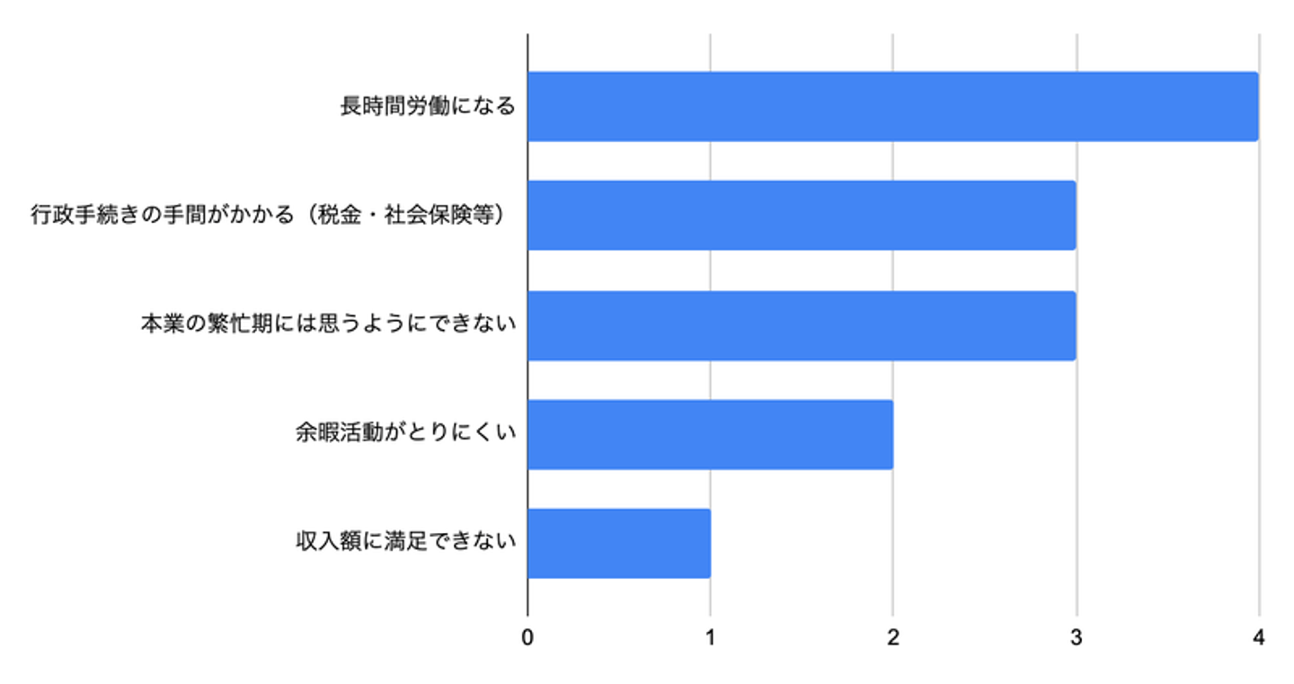 やはり、長時間労働になると答えた社員は多かったです。行政手続きに手間がかかるというのは予想外の回答でしたが、確かに1社で働くより自分でやらなければならない手続きが増えるイメージがあります。