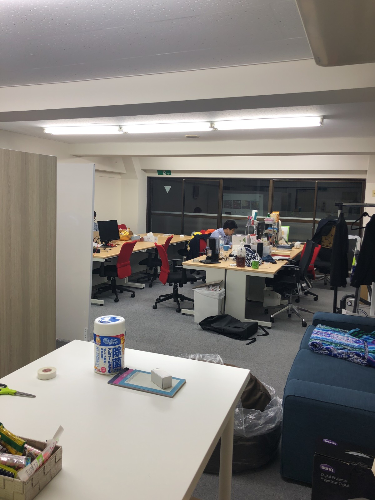 5階建ての階段しかない古びたビルでした。 お金がなかったので、2500円の椅子を買って、友人に頼んで組み立ててもらいました。 とりあえずパーテーションを立てて会議スペースを作り、 音はもちろん、全て外に聞こえます。