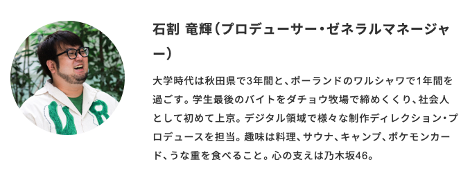そこから見えてきた魅力をクライアントに伝えたり、その体験をベースにした企画を提案したり、クライアントが向き合うターゲットと同じ目線をもってディスカッションできるように意識しています。ファンとしての体験を積み上げることで、提案するコンテンツや企画にもちゃんと自分の体重が乗るように感じます。そして、そのファンとしての体験を自分だけのものにせずに、クリエイティブチームへも共有し、チームみんなで愛着を持てるようにすることも、プロデューサーとして大切なことの1つだと思っています。」