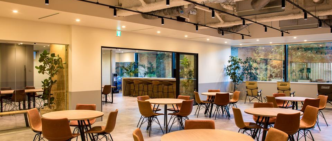 港区青山に構えるオフィスは開放的で、青山御苑の緑を一望でき、バーカウンターやカフェスペースはゆったり過ごすことができます。