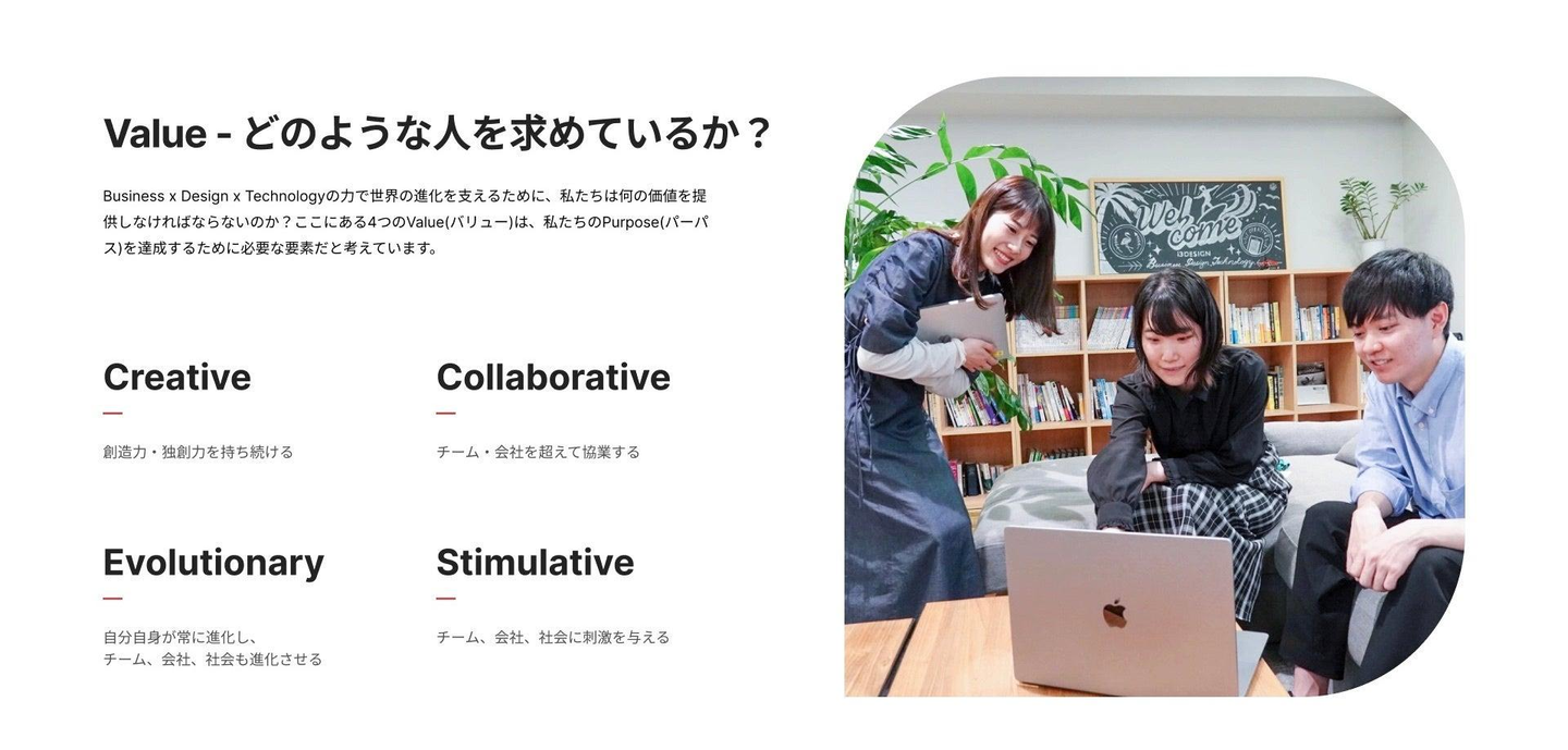 この4つのValuesを持ち合わせている方は間違いなく、弊社にマッチすると思われます。