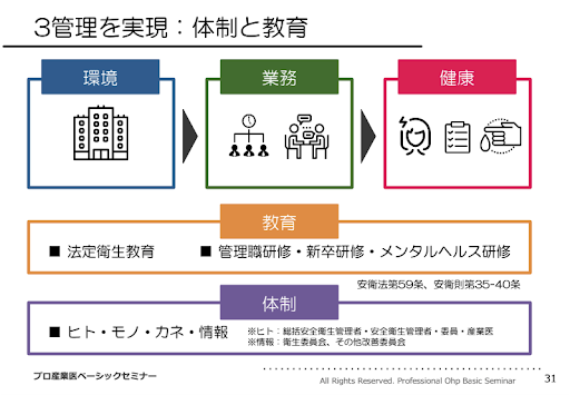 産業医や産業看護職として企業の健康管理に尽力されてきた方々には理解してもらえると思います。産業保健における鉄板のフレームワークと言えば5管理です。この5管理の中でも3管理(作業環境管理、作業管理、健康管理)が重要であり、さらに最も本質的な問題解決になるのは、作業環境管理だと教えられてきました。