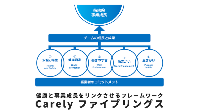 そこでiCAREでは企業が働くひとの健康を創る手法を包含したフレームワークを Carely Sustainable Expo 2021 において発表しました。これを「Carelyファイブリングス」と呼びます。