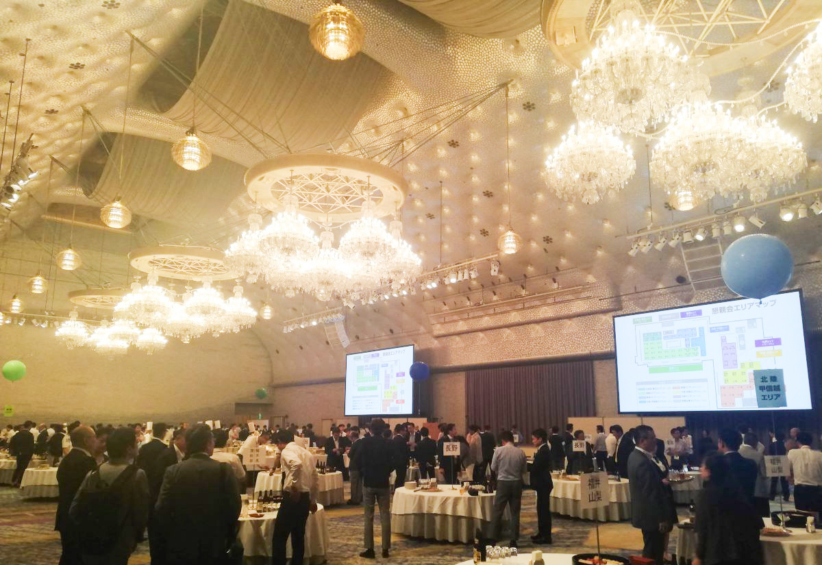 懇親会会場へ移動。高すぎる天井に大きなシャンデリアがいくつも並ぶ華やかな会場!そして、テーブルごとに各県の札がつけられており、地域ごとの企業が集まることで交流がしやすくなっているそうです。